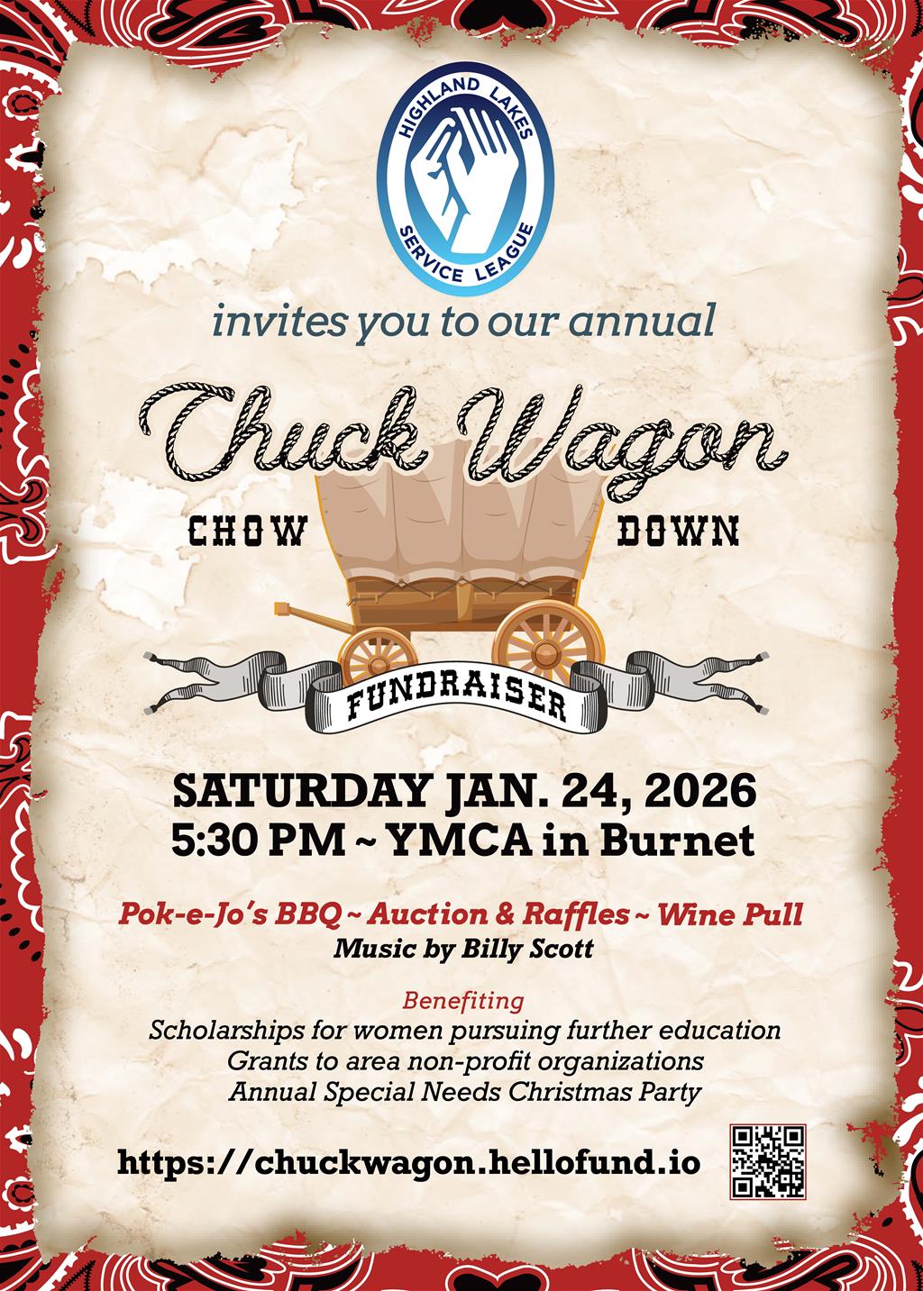 It was a spectacular evening on Saturday, January 25th, when almost 400 guests gathered at the YMCA in Burnet for the Highland Lakes Service League annual Chuck Wagon Chow Down Fundraiser. Participants enjoyed many activities, raffles, and live and silent auctions to support our mission. The night also included a delicious BBQ dinner catered by Pok-e-Jo's with entertainment provided by Billy Scott. Scotty Gibbs, along with his team from Aim High Fundraising & Benefit Auction Service, LLC, kept the crowd active during the live auction and mission giving portions of the evening. We are pleased to report we are able to contribute $155,863 to the community as a result.